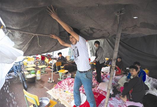 楚天都市報訊 圖為:昨日清晨,年輕的災(zāi)民們整理漏雨的簡易雨篷