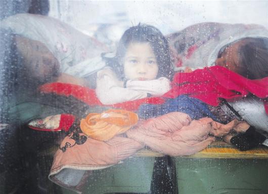 圖為:清晨,一名小災(zāi)民在雨篷里向外望
