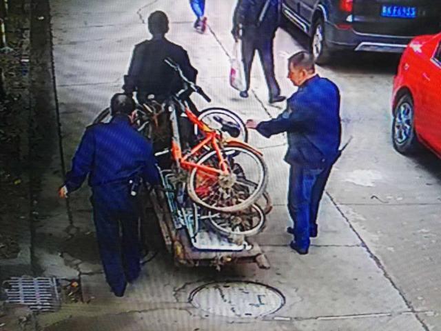 上月中旬,小區物業派保安人員清理6號樓架空層的非機動車車棚里的廢棄車輛,住在13號樓4樓的張女士發現停在樓下單元門門口的山地自行車不翼而飛,第二天和老公一起到物業調出監控錄像,驚奇地看到3名保安用板車拖著她家紅色山地車的畫面,當即拍下截圖。