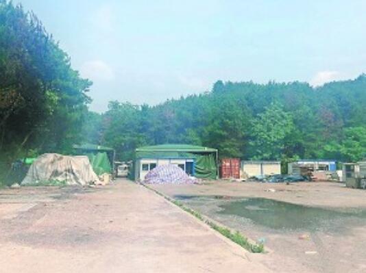 走訪過程中,記者發現,多輛大貨車往該物流公司旁邊的小路開去。過往市民反映:“沿著小路往里走60米左右是原先的釣魚磯山莊,山莊拆除后的空地上也有多個推拉棚和活動板房。可能由于不在路邊,一直沒有人去處置。”在市民的指示下,記者沿著物流公司邊的小路往里走,在距離江東南路約80米的地方,有一大片空地,面積約5000平方米,空地上多處堆放著生活垃圾和建筑廢料,也確實有兩個綠色推拉棚和多處活動板房。業主過某介紹,這片空地是由土地所有者陳某分租給他和另一位業主的。過某于2017年9月向陳某租用此地,用來經營活動板房租售業務,租期一年。另一位業主租用此地是用于堆放工地上使用的建筑材料。由于兩處生產經營活動都比較粗放,造成場地內的“臟亂”現象。