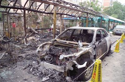 記者現場看到車棚外通道拉著警戒線,車棚內部倒伏著10多輛已被燒成骨架的電動車和自行車,車棚南側的一輛轎車已被燒成空殼,另一輛SUV車頭部位過火受損,距離兩車約5米遠的一輛轎車車頭右側也留下熏烤痕跡。