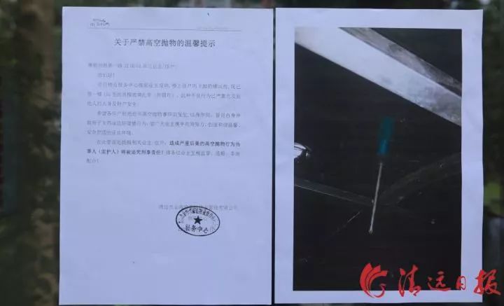 跟吳阿姨了解清楚情況后,記者來到了金海灣豪庭物業管理有限公司。該公司相關負責人告訴記者:“這件事發生后,我們都相當重視。當晚,我們值班的同事已經第一時間去到吳阿姨家,拍下螺絲刀直插雨棚的照片,然后他把這件事上報給了主管。但因為當時比較晚了,怕打擾業主休息,我們就沒有上樓詢問到底是誰家的螺絲刀。4日一早,我們就在該單元樓的正門張貼了關于嚴禁高空拋物的溫馨提示,也給該單元樓的其他住戶逐一打了電話,但沒有人認領那把螺絲刀,也沒有人承認自己高空拋物。”