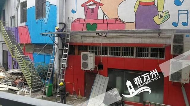 在執(zhí)法人員的指揮下,工人們熟練地搭好樓梯攀爬到雨棚下方的位置,利用繩索和專業(yè)焊接設(shè)備,分別對雨棚下方的金屬架和棚頂展開拆除工作。