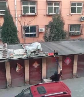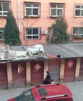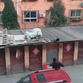 網(wǎng)友看到這樣的事后,就用梯子爬了上車棚頂,給貓咪做了個(gè)小窩,比較這冬天也到了。