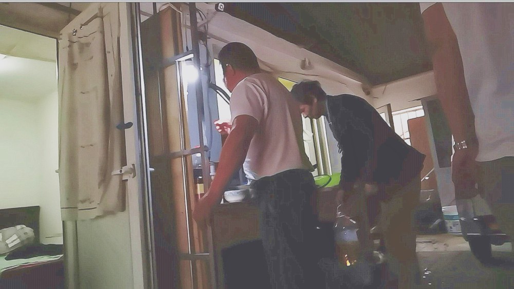 記者走進停車棚,發現除了車棚中央一塊七八十平方米的空地內停放著多輛電動自行車外,棚內西側和東側都搭建了多間簡易房。西側的兩間屋內亮著燈,其中一間屋內搭著一張單人床,另一間屋內是一張上下鋪,床上鋪著被褥,窗臺上擺著幾瓶調料,窗臺下面放著一口鐵鍋,地上擺著幾桶色拉油。
